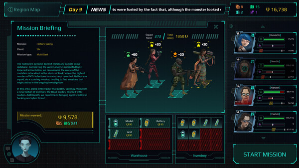 Twilight Warsは、メガコーポレーションが台頭し、データ、テクノロジー、影響力をめぐる陰謀渦巻く近未来を舞台にした、タクティカルダンジョンクローラーゲームです。秘密組織「トリプルAエージェンシー」の残された2人の生存者として、組織を再建し、陰謀の真相を暴いていくことが目的です。