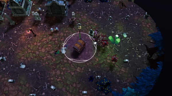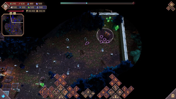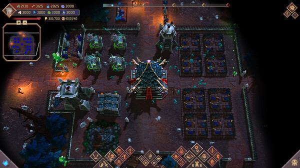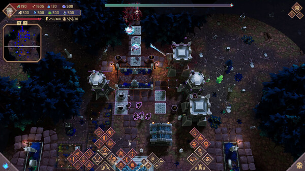 NecroCity は、冒頭の説明にもあるように、都市建設要素を持つRTSゲームです。ゲームは任務ベースで進行し、マップ上の限られたリソースを利用して自分の拠点を防衛することが目的となります。スケルトンたちを召喚して資源を集め、塔や陥阱を設置して敵を迎え撃つというタワーディフェンス要素も備えています。キャラクターを育成したり、様々なモジュールを組み合わせることで、自分なりの戦略を立てることができるのも魅力的ですね。
