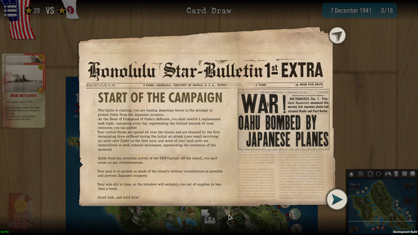 本作は、真珠湾攻撃の後の数日間を舞台にした作品です。日本軍は沖縄侵攻の準備を整え、アメリカ軍は必死の防衛体制を組みます。プレイヤーは日本軍か米軍のどちらかを指揮し、限られた時間内に勝利を目指します。日本軍は迅速な攻撃で米軍基地を壊滅させる必要があり、米軍は侵攻を阻止しなければなりません。様々な作戦カードを使い分けることで、プレイヤーの戦略性が発揮されます。短期決戦の緊迫感と、歴史的な背景が魅力的な作品となっています。