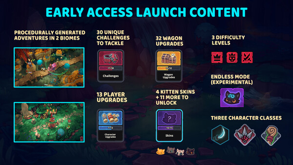Wild Woodsは、1人から4人でプレイできるアクションと協力の要素が強いゲームです。プレイヤーは勇敢な子猫の役割を担い、危険な森の中を進む木製の荷車を守り抜く必要があります。昼は資源を集めて荷車を強化し、夜はバンディット・ウサギやバジャーなどの敵から荷車を守らなければなりません。難易度を選んで、より大きな報酬を目指すことができます。プレイスタイルは自由で、ローカル、オンライン、またはその組み合わせで遊べます。