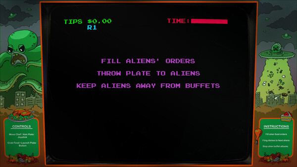 Invasion of the Buffet Snatchers は、シンプルで楽しく挑戦的な1画面アーケードゲームです。美しいドット絵のグラフィックが特徴です。アリエンに好きな料理を提供して追い払うのが目的です。間違った料理を何度も提供すると怒られ、料理を提供するのが遅いとアリエンが自分で buffet を奪っていきます。複数の料理を同時に出すことでコンボを作り、大きな得点を稼ぐことができます。