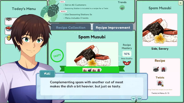 「Kitchen Sync: Aloha!」は、視覚小説とタイムマネジメントゲームが融合したユニークなジャンルのゲームです。ハワイの島・マイカイを舞台に、2人の兄弟、カイとカラが家族のレストランを立て直すために奮闘します。グリッド状のマップ上で、各キャラクターに料理を割り振り、効率的に調理を行っていきます。キャラクター間の絆を深めることで、特殊な技や新しいレシピが開発できるなど、ゲームシステムとストーリーが深く連動しています。手順の立て方や材料の組み合わせなど、料理のクオリティを高めるための戦略性も重要です。遊び込めば、キャラクター同士の恋愛まで発生するなど、遊び応えが十分にあります。