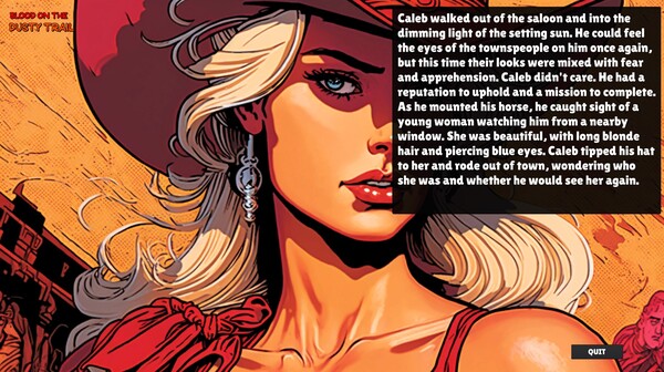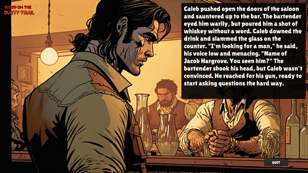 Blood On The Dusty Trail は、アウトローたちの大胆な逃避行を描いたオーディオブックゲームです。完全な音声ナレーションで物語を追体験できる「オートプレイモード」と、テキストを読み進めるペースを自分で調整できる「通常プレイモード」の2つのプレイスタイルが用意されています。臨場感あふれるストーリーと迫力のアクションシーンを、まるで映画を見るような感覚で楽しめます。リアルな背景イラストと登場人物の詳細なキャラクターデザインにも注目です。