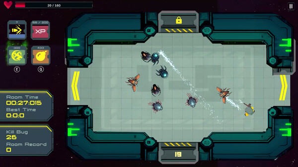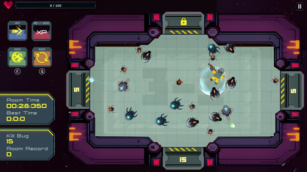 Unrestricted Pest Controlは、トップダウンのシューティングゲームで、ローグライト要素とユニークな部屋/階層システムが特徴です。 殺虫剤を持った駆除人として、核研究施設内のバグの問題を解決することが目標です。 放射能の影響で適応力と生存能力を高めたムシたちは、新しい能力を身につけ、奇抜に変異しています。 生き残るには、武器を賢明に使い分ける必要があります。 階層ごとのボスを倒し、上の階層に進んでいく展開が特徴的です。 一度階層をクリアすれば、以降はその階層から挑戦できるようになるので、最終ボスまでダイレクトに挑めるという自由度も備えています。