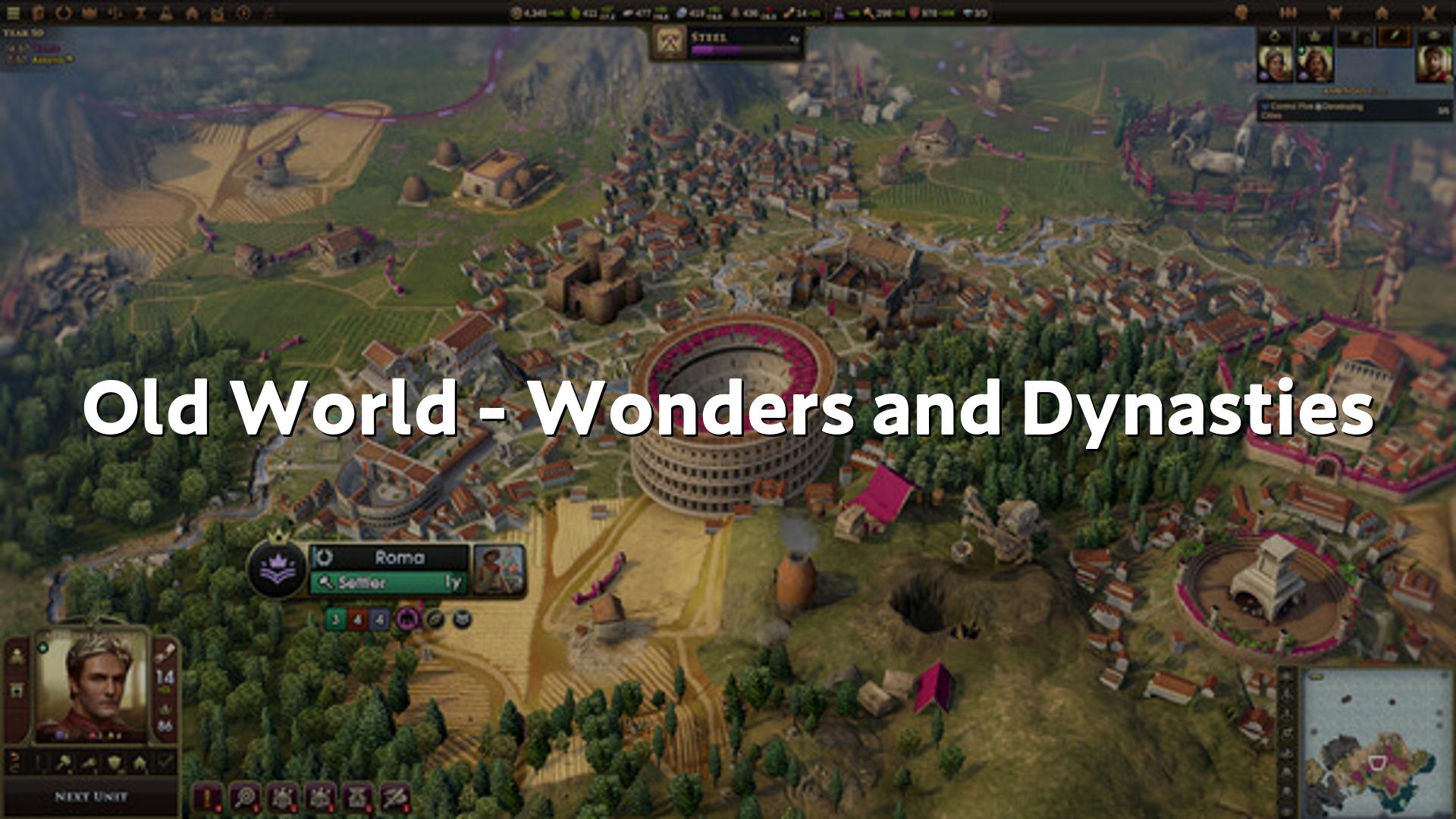 Old World – Wonders and Dynastiesは、古代世界を舞台にするターン制戦略ゲームOld Worldの大型拡張パックで、30種類の新しい開始条件となる指導者が追加され、攻略の幅が広がります、各帝国に複数の新リーダーが用意され、家系図や固有の特性、イベントが導入されることで、同じ勢力でもまったく異なる物語が紡がれるのが特徴です、新たに8つの「ワンダー」が追加され、それぞれがゲーム終盤だけでなく、序盤から中盤にかけて戦略を大きく変える強力なボーナスを提供します、例えば、ジェルワン水道は無料のスペシャリストを獲得でき、アル・カズネは交易の中心地となる効果をもたらし、コロッセウムは剣士を量産する特異な効果を生み出すなど、戦略の自由度が増しています、さらに100以上の王朝関連イベント、21のキャラクター固有特性、120名を超える歴史的人物の追加によって、プレイごとにユニークなドラマが生まれるよう設計されています、