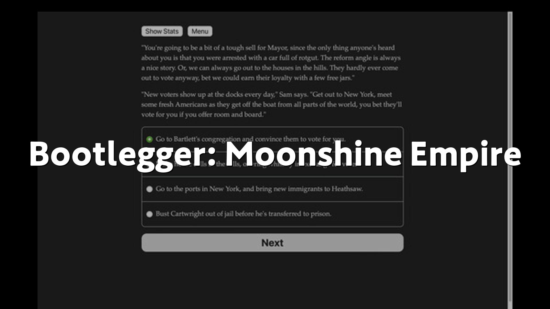 Bootlegger: Moonshine Empireは、Drew Morrisonによる完全文章ベースのインタラクティブな歴史小説で、約21万語に及ぶテキストと数百に及ぶ選択肢で物語が分岐します、舞台は1920年のアメリカ、禁酒法によってアルコールが違法化された直後の混乱した時代で、田舎で密造を始めたあなたがニューヨーク進出を目指して組織を拡大していくストーリーです、密造、運搬、取引、労務管理、政治的駆け引き、さらにはブロードウェイを使った資金洗浄やギャング同士の抗争まで、多彩な選択と結果が用意されています、プレイヤーは性別や性的指向を自由に設定でき、リーダーとして従業員を慈悲深く扱うか、冷酷に搾取するかなど、価値観に基づく判断で物語が変わります、文章による没入体験がメインのため、グラフィックや効果音ではなく、読み進めることそのものがゲームプレイの中心となる作品です、