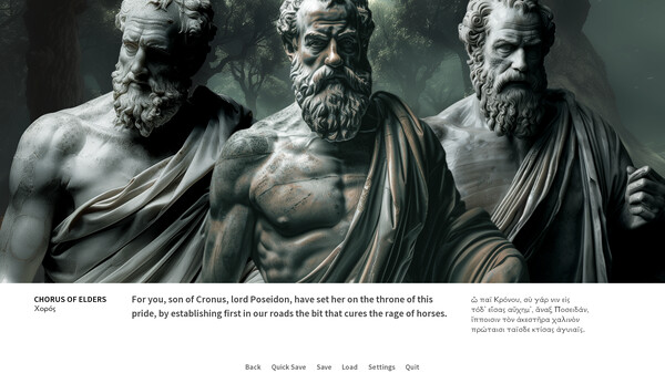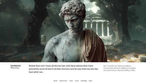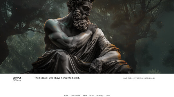 本作は、ソポクレスの三大悲劇「オイディプース王」「オイディプース・アト・コロノス」「アンティゴネー」を一つにまとめたグラフィックアドベンチャーです。登場人物たちは、時代を経て損傷を受けた美しい古代ギリシャの彫刻で表現されており、それを読み進めるうちに徐々に物語の悲劇が明らかになっていきます。リチャード・ジェブの英語翻訳テキストに、ラテン語の原文が対訳で掲載されており、音楽とサウンドエフェクトがゲームの雰囲気を盛り上げます。プレイヤーは、ギリシャ悲劇の集大成とも言える三部作の核心に迫っていくことになるでしょう。