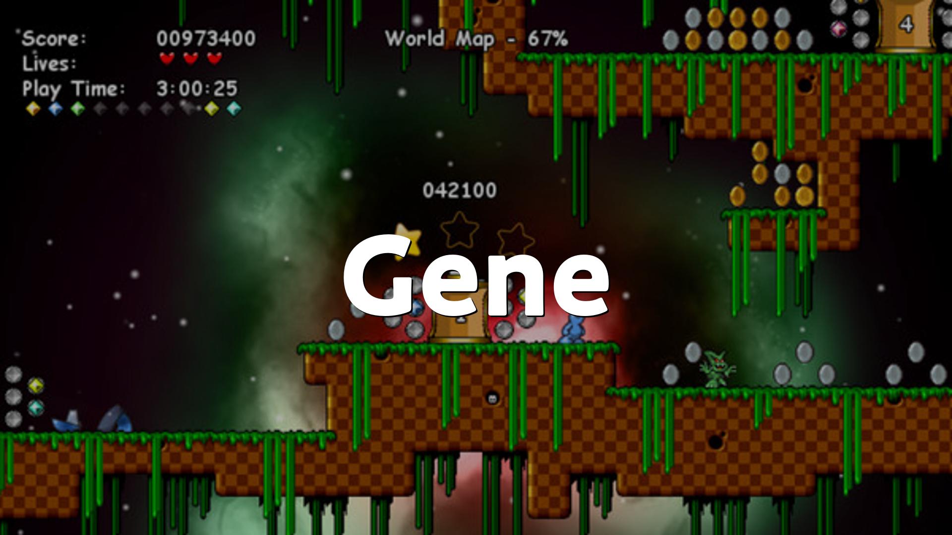 Geneは、主人公の遺伝子変異を集めて、墜落した宇宙船のパーツと盗まれた宝石を取り戻す、横スクロールのプラットフォームゲームです、