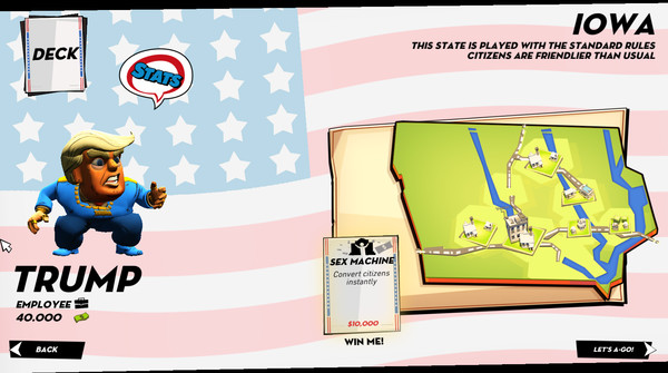 Megalo Polisはアメリカ大統領選をモチーフにしたリアルタイムストラテジーゲームで、プレイヤーは候補者となり、全米の州を巡って支持を拡大していきます、