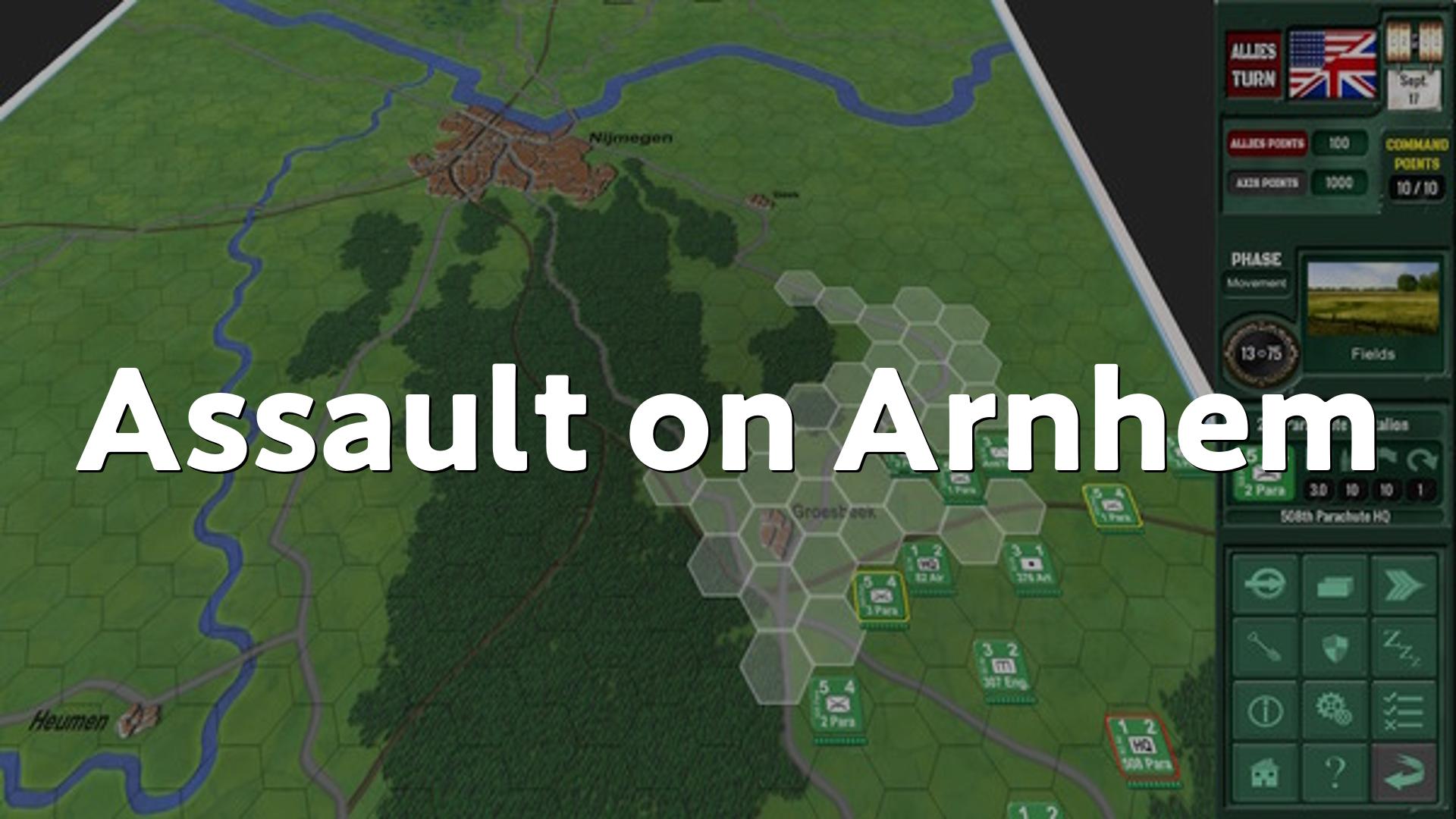 Assault on Arnhemは、1944年9月のマーケット・ガーデン作戦を基にした、1人から4人で遊べるオペレーショナルレベルのウォーゲームです、プレイヤーは連合軍か枢軸軍のどちらかを操作し、オランダのアーネムへと続く橋を巡る攻防を繰り広げます、ゲームの目的は、決められたターン数内に橋の目標を奪取するか、防衛して守り抜くことです、ターン制で進行し、夜戦や視界制限、フォグ・オブ・ウォー、補給ライン管理などの要素が組み込まれていて、戦場の緊張感を再現しています、シナリオはグレーヴ、ナイメーヘン、アーネム、本作戦を含む複数が用意され、110以上のユニット種別で多彩な戦術を試せます、チュートリアルや3段階のAI難易度があり、初心者から玄人まで幅広く楽しめる作りになっています。