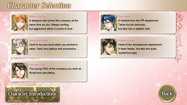 Office Loversは、メイクアップ会社に勤めるヒロインが、新製品開発チームに選ばれたことをきっかけに、上司や同僚との恋愛を経験するオトメゲームです。モブキャラクターも含めた全社員がヒロインに興味を持ち、自分の思いを伝えようと積極的に接近してくるというストーリーになっています。ゲームは、5人の男性キャラクターそれぞれの物語を楽しめる個別ルート形式で構成されており、良エンディングや秘密のデートシーンなども用意されています。ゲームの舞台はオフィスワークの様子が描かれ、メイクアップに関する設定も組み込まれているので、現代社会のリアリティを感じられるでしょう。
