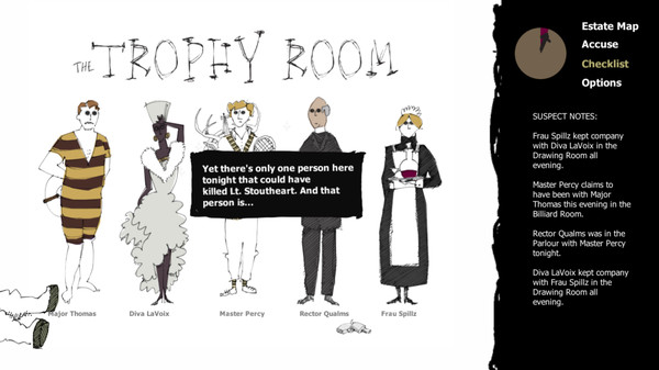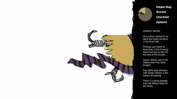 A Matter of Murderは、ポイント&クリック形式の推理パズルゲームで、ローグライク的な要素を持ち、事件の詳細が毎回プロシージャルに生成されることが特徴です、屋敷内の各部屋を調べ、容疑者に質問を投げ、手がかりをノートにまとめて犯行の真相を導き出していきます、各エピソードは短く、5分〜10分程度で終わるものが多いため、集中して何度も挑戦できるテンポ感があります、キャンペーンモードでは15件ほどの用意された事件があり、進めるごとに論理パズルの難度が上がっていきます、さらに「Generate case」機能で複数のパズル要素をランダムに組み合わせたケースを生成でき、これにより非常に高いリプレイ性を実現しています、手描き風のビクトリア朝風キャラアートや、状況に応じて変化する音楽など、雰囲気作りにも力が入っている作品です。