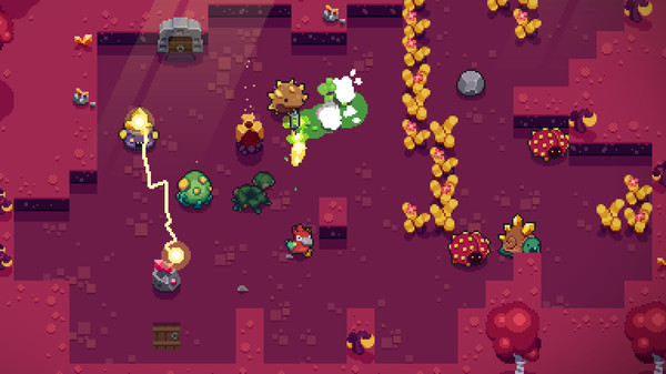 Blazing Beaksは、武器を持った鳥型の主人公が戦うローグライクアクションゲームです。ランダム生成される迷宮を探索し、さまざまな敵を撃ち倒していきます。強力なアーティファクトを集めて自分の能力を強化したり、仲間と協力して攻略したりと、遊び方は自由自在。ステージクリアごとにダメージを受けて弱体化していくため、上手にアイテムを使いながら進んでいく必要があります。