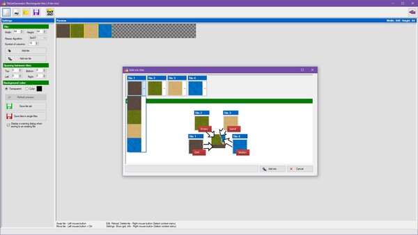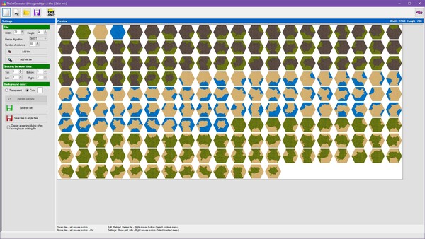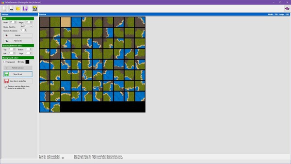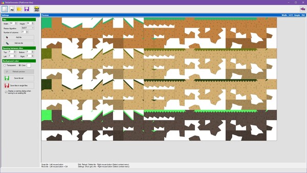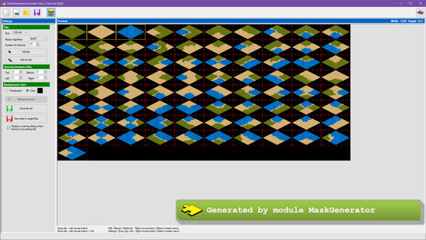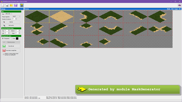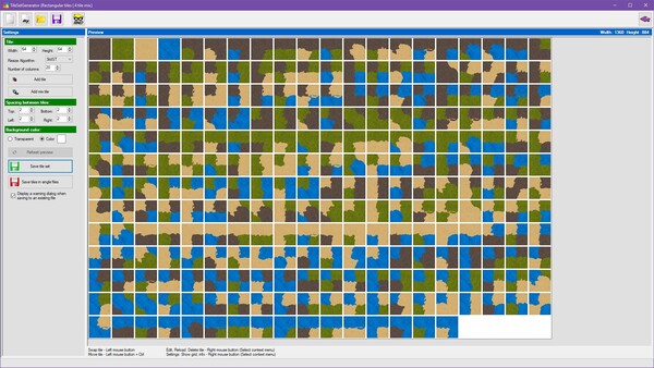 TileSetGeneratorは、ゲームの背景にあるタイルを簡単に生成できるツールです。正方形や等角、六角形などさまざまなタイル形式に対応しており、1枚から4枚のテクスチャを組み合わせることで、無数のデザインのタイルを作り出すことができます。タイルの配置や行列の変更、透明化の設定なども簡単にできるので、ゲームの雰囲気に合わせてカスタマイズすることができます。生成したタイルはPNGやBMPなどの一般的な画像形式で出力できるため、GameMakerやRPGツクールなど、さまざまなゲームエンジンで使用できます。