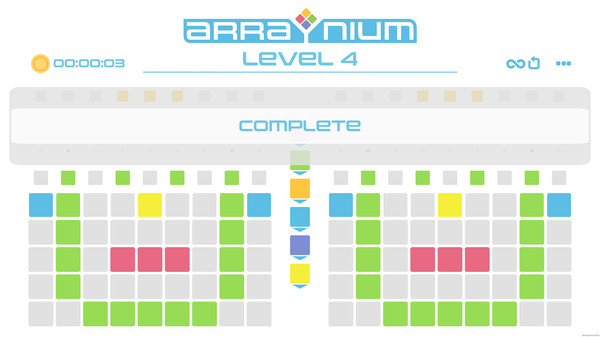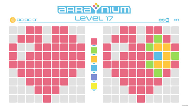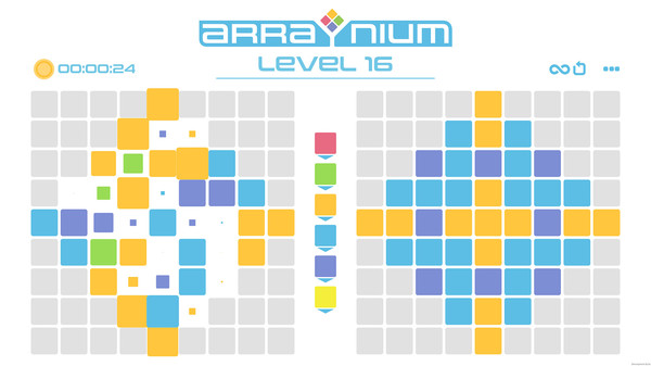 Arrayniumは、画面左側のブロック群を操作して右側のブロックと同じ配色に揃えることが目的のパズルゲームです、