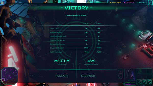 Re-Legionは、預言者となって信仰心を武器に戦っていく、サイバーパンク風のユニークなRTSゲームです。信者を集め、都市の支配権を争うといった新鮮な体験が楽しめます。ストーリーモードもしっかりと描かれており、設定やキャラクターの魅力にも注目です。ただ、物語の長さが少し短めのようですが、DLCによってさらなる遊び応えが用意されているなど、全体としては高い評価に値するゲームだと思います。(編集部)