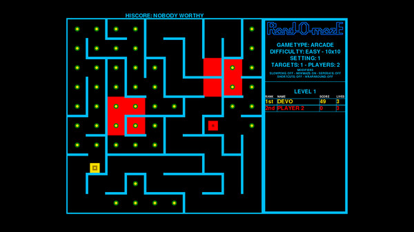 Rand-O-mazEは最大8人まで同時プレイできるランダム生成型メイズゲームです。1970年代から1990年代のクラシックアーケードゲームをインスピレーションに開発されており、単純明快なルールながらも奥深い戦略性が味わえます。3つの難易度設定から選べ、アーケード、ゴミ捨て、レース、椅子取りゲーム、ボール遊びといった5つのゲームモードが用意されています。キーボードやゲームパッドでの操作が可能で、ラップアラウンドやショートカットなどさまざまなゲームモディファイアーにも対応しているため、ゲームの選択肢が広がっています。プレイヤーのスコアを詳細に記録する機能も備わっているので、ランキング争いを楽しむこともできます。オールドスクールな雰囲気と遊び心あふれるゲームデザインが特徴的です。