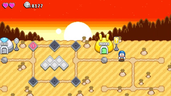 マップはクラシックなトップダウンのステージ選択で、ショップでパワーアップや消費アイテムを購入でき、