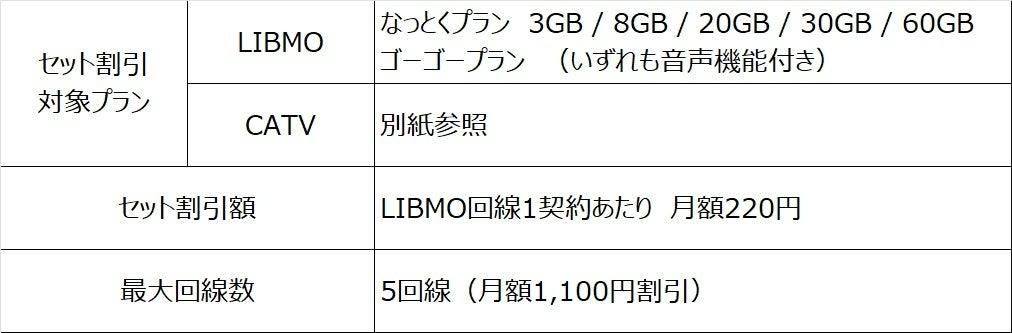 LIBMOとCATV会社のセット割対象サービスのご利用により、LIBMO 1回線につき、月額220円割引いたします(最大5回線 月額1,100円割引)。