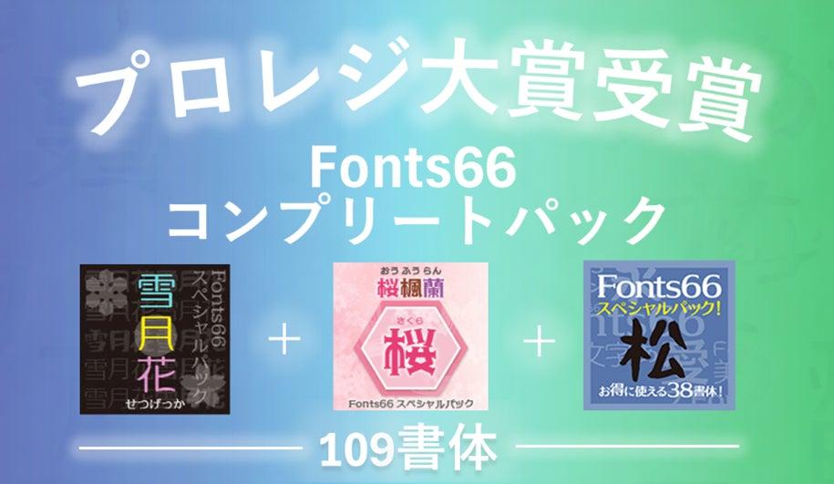 本パックは、Windows標準フォント『メイリオ』を手がけた書体デザイナー、鈴木竹治氏によるフォントブランド「Fonts66」シリーズの全書体を収録したものです。パックには「松」「雪月花」「桜」の3つのフォントパックが含まれており、合計109書体がラインナップされています。